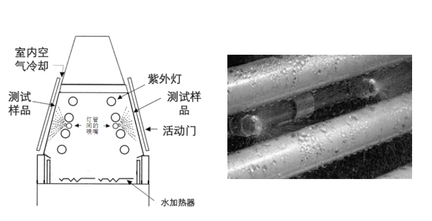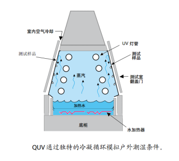 QUV冷凝系統實質上是蒸發的水蒸汽被實驗箱的樣板限制在實驗箱內,樣板背面的空氣使樣板溫度水蒸汽溫度低一些,這個溫差使得水蒸汽在樣板上凝聚。冷凝循環期間,水通過水盤下的加熱元件加熱,水蒸汽充滿試驗箱,在100%濕度時達到平衡,水蒸汽連續在樣品上凝結,而它們通過其背面的室內空氣保持低溫。在樣品上凝結蒸汽,最后流回到水盤里。
