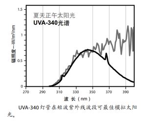 a) UVA-340: 能發出從315nm到400nm間的太陽光的波長,它的輻射峰值是在340nm處。UVA-340對不同試驗的對照測試尤其有用,在短波紫外線波段可最佳模擬太陽光。